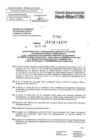 Arrêté 2018-0071 DFAS portant fixation des tarifs journaliers afférents à un ensemble de prestations relatives à l'hébergement et du financement des prestations afférentes à la dépendance EHPAD Centre Alsace COLMAR Sites Diaconat et Home Florimont INGERSH
