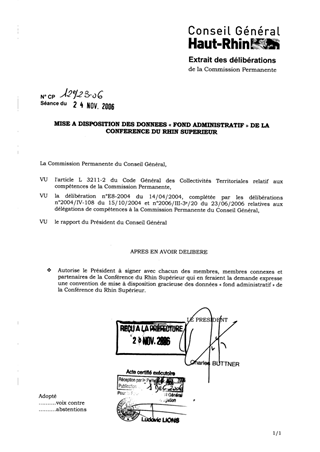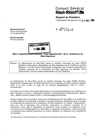 Le Département du Haut-Rhin assure la maîtrise d’ouvrage du projet SIGRS (Système d’Information Géographique du Rhin Supérieur) de la Conférence du Rhin Supérieur. A ce titre il gère et peut mettre à disposition des membres, partenaires et membres connexes de la Conférence du Rhin Supérieur les données "Fond Administratif" couvrant l'espace géographique du Rhin Supérieur.