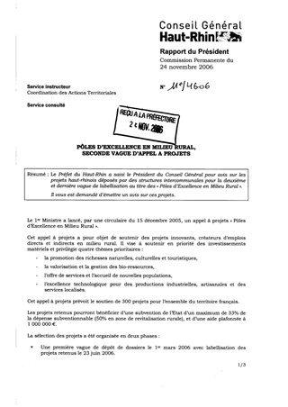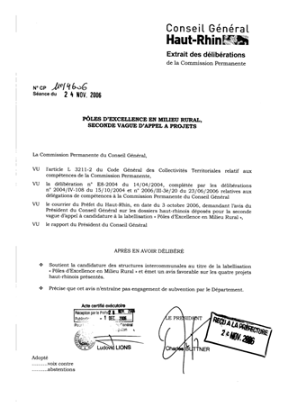 Le Préfet du Haut-Rhin a saisi le Président du Conseil Général pour avis sur les projets haut-rhinois déposés par des structures intercommunales pour la deuxième et dernière vague de labellisation au titre des « Pôles d’Excellence en Milieu Rural ». Il vous est demandé d’émettre un avis sur ces projets.
