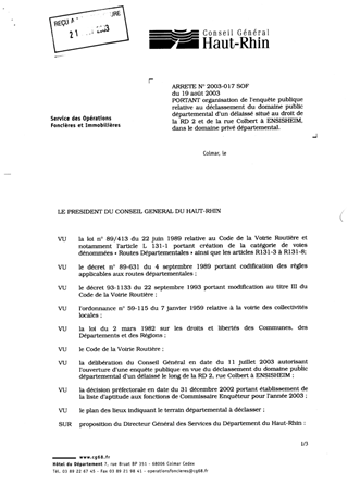 portant organisation de l'enquête publique relative au déclassement du domaine public départemental d'un délaissé situé au droit de la RD 2 et de la rue Colbert à ENSISHEIM, dans le domaine privé départemental. Resumé Pièces jointes ARRETE Assemblée : Non défini Date : 19/08/2003 Rapporteur : Non défini Collectivité : Conseil départemental du Haut-Rhin Direction : Non défini Service : Service du Patrimoine et du droit des Sols Domaine : Déclassement de voirie Commission :