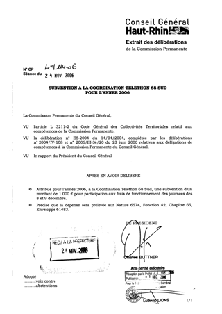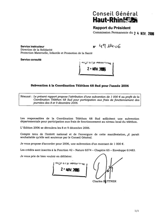 Le présent rapport propose l’attribution d’une subvention de 1 000 € au profit de la Coordination Téléthon 68 Sud pour participation aux frais de fonctionnement des journées des 8 et 9 décembre 2006.
