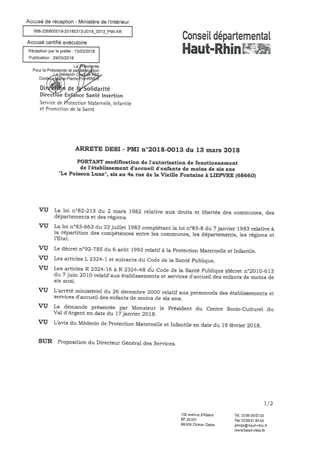 portant modification de l'autorisation de fonctionnement de l'établissement d'accueil d'enfants de moins de six ans, "Le Poisson Lune" , sis au 4a rue de la Vieille Fontaine à LIEPVRE (68660) Resumé Pièces jointes ARRETE Assemblée : Non défini Date : 13/03/2018 Rapporteur : Non défini Collectivité : Conseil départemental du Haut-Rhin Direction : Non défini Service : Direction de la Solidarité Domaine : Accueil d'enfants Commission :