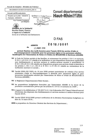 portant fixation des tarifs horaires pour l'année 2018 du service d'aide et d'accompagnement à domicile pour les personnes âgées et les personnes adultes handicapées de l'association de soins et d'aides de MULHOUSE et environs (ASAME) Resumé Pièces jointes ARRETE Assemblée : Non défini Date : 15/03/2018 Rapporteur : Non défini Collectivité : Conseil départemental du Haut-Rhin Direction : Non défini Service : Direction de la Solidarité Domaine : Prix de Journée Commission :