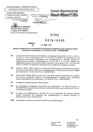 portant notification de la décision d'autorisation budgétaire pour l'exercice 2018 concernant l'association "Le Droit de Vivre" à MULHOUSE Resumé Pièces jointes ARRETE Assemblée : Non défini Date : 15/03/2018 Rapporteur : Non défini Collectivité : Conseil départemental du Haut-Rhin Direction : Non défini Service : Direction de la Solidarité Domaine : Dotations financières Commission :