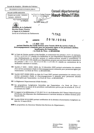 portant fixation des tarifs horaires pour l'année 2018 du service d'aide et d'accompagnement à domicile pour les personnes âgées et les personnes adultes handicapées de l'association "Le Droit de Vivre" à MULHOUSE Resumé Pièces jointes ARRETE Assemblée : Non défini Date : 15/03/2018 Rapporteur : Non défini Collectivité : Conseil départemental du Haut-Rhin Direction : Non défini Service : Direction de la Solidarité Domaine : Prix de Journée Commission :
