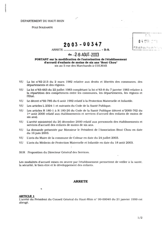 portant sur la modification de l'autorisation de l'établissement d'accueil d'enfants de moins de six ans "Bout Chou" sis au 5 rue des Marchands à COLMAR. Resumé Pièces jointes ARRETE Assemblée : Non défini Date : 26/08/2003 Rapporteur : Non défini Collectivité : Conseil départemental du Haut-Rhin Direction : Non défini Service : Direction de la Solidarité Domaine : Accueil d'enfants Commission :