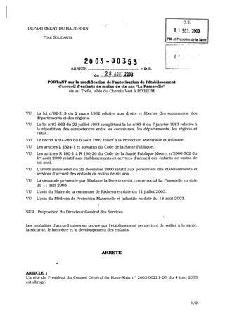 portant sur la modification de l'autorisation de l'établissement d'accueil d'enfants de moins de six ans "La Passerelle" sis au Trèfle, allée du Chemin Vert à RIXHEIM. Resumé Pièces jointes ARRETE Assemblée : Non défini Date : 28/08/2003 Rapporteur : Non défini Collectivité : Conseil départemental du Haut-Rhin Direction : Non défini Service : Direction de la Solidarité Domaine : Accueil d'enfants Commission :
