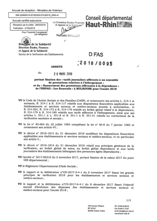 portant fixation des "tarifs journaliers afférents à un ensemble de prestations relatives à l'hébergement" et du "financement des prestations afférentes à la dépendance" de l'EHPAD "Les Ecureuils" à MULHOUSE pour l'année 2018 Resumé Pièces jointes ARRETE Assemblée : Non défini Date : 28/03/2018 Rapporteur : Non défini Collectivité : Conseil départemental du Haut-Rhin Direction : Non défini Service : Direction de la Solidarité Domaine : Prix de Journée Commission :