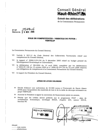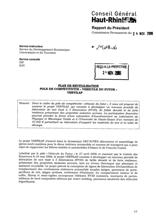 Dans le cadre du pôle de compétitivité « véhicule du futur », il vous est proposé de soutenir le projet VERTILAP, qui consiste à développer un nouveau procédé de fabrication de non tissé à 3 dimensions (NT3D), de faible densité et de forte résilience présentant des propriétés isolantes accrues. La participation financière pourrait prendre la forme d’une subvention d’investissement au Laboratoire de Physique et Mécanique Textile et à l’Université de Haute-Alsace d’un montant de 45 000 € permettant au laboratoire d’acquérir les matériels de test et la table de découpe.