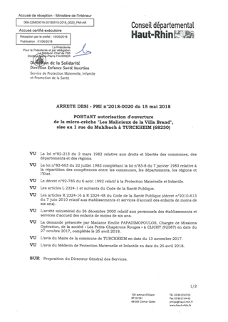 portant autorisation d'ouverture de la micro-crèche "Les Malicieux de la Villa Brand", sise au 1 rue du Muhlbach à TURCKHEIM (68230) Resumé Pièces jointes ARRETE Assemblée : Non défini Date : 15/05/2018 Rapporteur : Non défini Collectivité : Conseil départemental du Haut-Rhin Direction : Non défini Service : Direction de la Solidarité Domaine : Accueil d'enfants Commission :