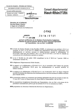 portant notification de la décision d'autorisation budgétaire et fixation du prix de journée 2018 du foyer d'accueil spécialisé de l'association "Arc en Ciel" à AUBURE. Resumé Pièces jointes ARRETE Assemblée : Non défini Date : 11/06/2018 Rapporteur : Non défini Collectivité : Conseil départemental du Haut-Rhin Direction : Non défini Service : Direction de la Solidarité Domaine : Prix de Journée Commission :