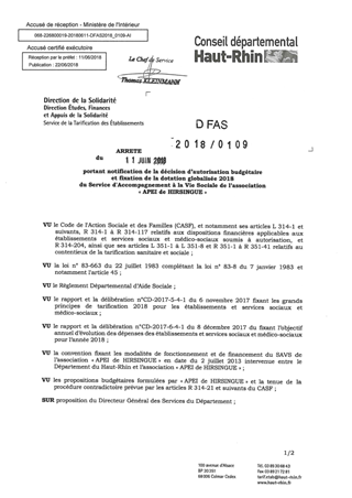 portant notification de la décision d'autorisation budgétaire et fixation de la dotation globalisée 2018 du service d'accompagnement à la vie sociale de l'association "APEI de HIRSINGUE" Resumé Pièces jointes ARRETE Assemblée : Non défini Date : 11/06/2018 Rapporteur : Non défini Collectivité : Conseil départemental du Haut-Rhin Direction : Non défini Service : Direction de la Solidarité Domaine : Dotations financières Commission :