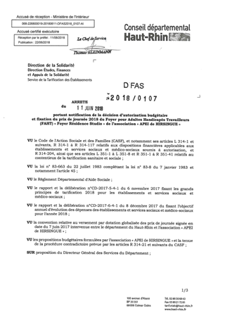portant notification de la décision d'autorisation budgétaire et fixation du prix de journée 2018 du foyer pour adultes handicapés travailleurs (FAHT) "Foyer résidence studio" de l'association "APEI de HIRSINGUE" Resumé Pièces jointes ARRETE Assemblée : Non défini Date : 11/06/2018 Rapporteur : Non défini Collectivité : Conseil départemental du Haut-Rhin Direction : Non défini Service : Direction de la Solidarité Domaine : Prix de Journée Commission :