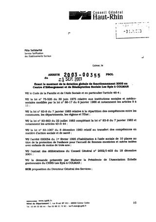 fixant le montant de la dotation gloable de fonctionnement 2003 au Centre d'Hébergement et de Réadaptation Sociale Les Epis à COLMAR. Resumé Pièces jointes ARRETE Assemblée : Non défini Date : 01/09/2003 Rapporteur : Non défini Collectivité : Conseil départemental du Haut-Rhin Direction : Non défini Service : Service de la Tarification des Etablissements Domaine : Dotations financières Commission :