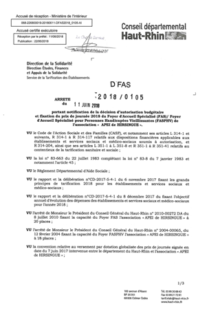 portant notification de la décision d'autorisation budgétaire et fixation du prix de journée 2018 du foyer d'accueil spécialisé (FAS) / Foyer d'accueil spécialisé pour personnes handicapées veillissantes(FASPHV) de l'association "APEI de HIRSINGUE" Resumé Pièces jointes ARRETE Assemblée : Non défini Date : 11/06/2018 Rapporteur : Non défini Collectivité : Conseil départemental du Haut-Rhin Direction : Non défini Service : Direction de la Solidarité Domaine : Prix de Journée Commission :