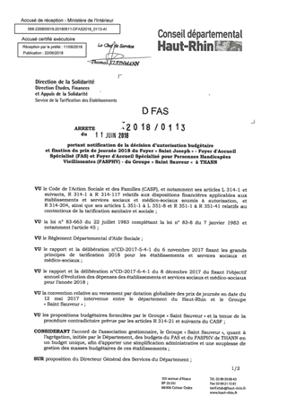 portant notification de la décision d'autorisation budgétaire et fixation du prix de journée 2018 du foyer "Saint Joseph" - Foyer d'accueil spécialisé (FAS) et foyer d'accueil spécialisé pour personnes handicapées vieillissantes (FASPHV) - du Groupe "Sain