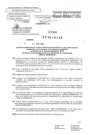 portant modification de l'arrêté DFAS N°2018/0109 du 11.06.2018 portant notification de la décision d'autorisation budgétaire et fixation de la dotation 2018 du service d'accompagnement à la vie sociale de l'association "APEI de HIRSINGUE" Resumé Pièces jointes ARRETE Assemblée : Non défini Date : 21/06/2018 Rapporteur : Non défini Collectivité : Conseil départemental du Haut-Rhin Direction : Non défini Service : Direction de la Solidarité Domaine : Dotations financières Commission :