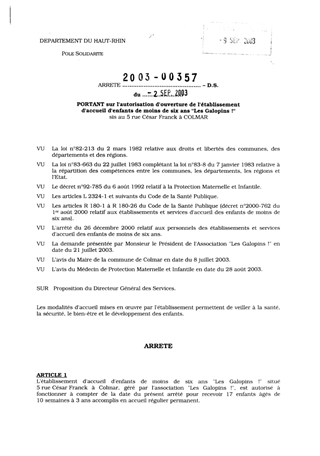 portant sur l'autorisation d'ouverture de l'établissement d'accueil d'enfants de moins de six ans "Les Galopins !" sis au 5 rue César Franck à COLMAR. Resumé Pièces jointes ARRETE Assemblée : Non défini Date : 02/09/2003 Rapporteur : Non défini Collectivité : Conseil départemental du Haut-Rhin Direction : Non défini Service : Direction de la Solidarité Domaine : Accueil d'enfants Commission :