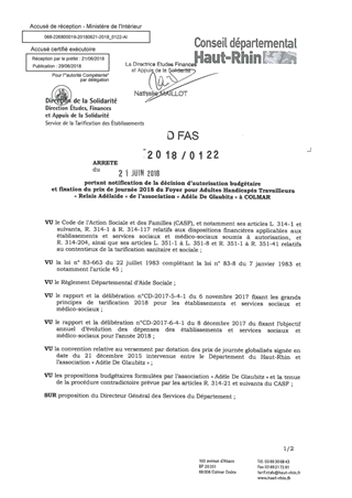 portant notification de la décision d'autorisation budgétaire et fixation du prix de journée 2018 du foyer pour adultes handicapés travailleurs "Relais Adélaïde" de l'association "Adèle de Glaubitz" à COLMAR Resumé Pièces jointes ARRETE Assemblée : Non défini Date : 21/06/2018 Rapporteur : Non défini Collectivité : Conseil départemental du Haut-Rhin Direction : Non défini Service : Direction de la Solidarité Domaine : Prix de Journée Commission :