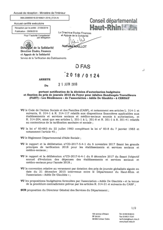 portant notification de la décision d'autorisation budgétaire et fixation du prix de journée 2018 du foyer pour adultes handicapés travailleurs (FAHT) "Les Résidences" de l'association "Adèle de Glaubitz" à CERNAY Resumé Pièces jointes ARRETE Assemblée : Non défini Date : 21/06/2018 Rapporteur : Non défini Collectivité : Conseil départemental du Haut-Rhin Direction : Non défini Service : Direction de la Solidarité Domaine : Prix de Journée Commission :