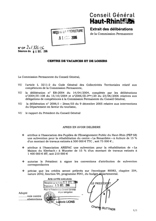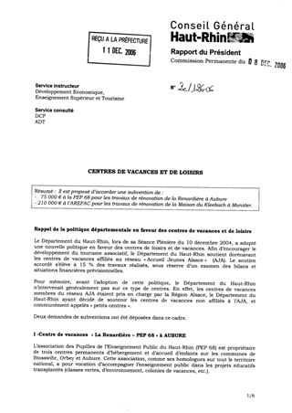 Il est proposé d’accorder une subvention de : - 75 000 € à la PEP 68 pour les travaux de rénovation de la Renardière à Aubure - 210 000 € à l’AREFAC pour les travaux de rénovation de la Maison du Kleebach à Munster.