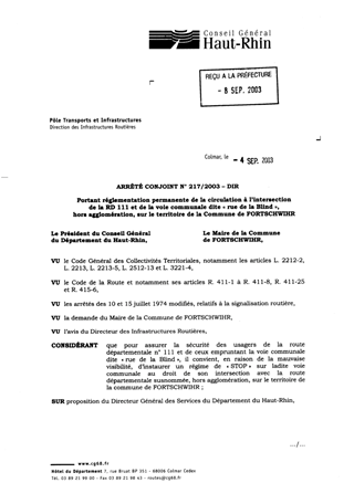 portant réglementation permanente de la circulation à l'intersection de la RD 111 et de la voie communale dite "rue de la Blind", hors agglomération, sur le territoire de la commune de FORTSCHWIHR. Resumé Pièces jointes ARRETE Assemblée : Non défini Date : 04/09/2003 Rapporteur : Non défini Collectivité : Conseil départemental du Haut-Rhin Direction : Non défini Service : Direction des Routes Domaine : Circulation Commission :