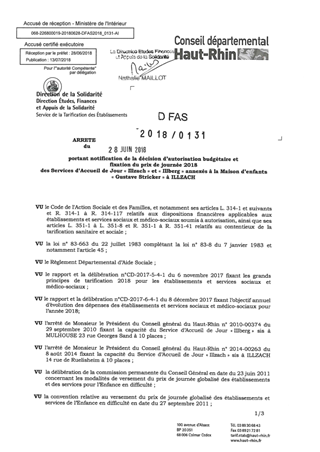 portant notification de la décision d'autorisation budgétaire et fixation du prix de journée 2018 des services d'accueil de jour "Illzach" et "Illberg" annexés à la maison d'enfants "Gustave Fricker" à ILLZACH Resumé Pièces jointes ARRETE Assemblée : Non défini Date : 28/06/2018 Rapporteur : Non défini Collectivité : Conseil départemental du Haut-Rhin Direction : Non défini Service : Direction de la Solidarité Domaine : Prix de Journée Commission :