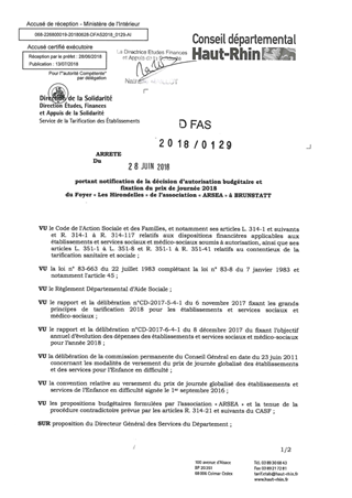 portant notification de la décision d'autorisation budgétaire et fixation du prix de journée 2018 du foyer "Les Hirondelles" de l'association "ARSEA" à BRUNSTATT Resumé Pièces jointes ARRETE Assemblée : Non défini Date : 28/06/2018 Rapporteur : Non défini Collectivité : Conseil départemental du Haut-Rhin Direction : Non défini Service : Direction de la Solidarité Domaine : Prix de Journée Commission :