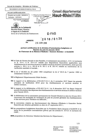 portant notification de la décision d'autorisation budgétaire et fixation du prix de journée 2018 de l'internat de la maison d'enfants "Gustave Stricker" à ILLZACH Resumé Pièces jointes ARRETE Assemblée : Non défini Date : 28/06/2018 Rapporteur : Non défini Collectivité : Conseil départemental du Haut-Rhin Direction : Non défini Service : Direction de la Solidarité Domaine : Prix de Journée Commission :