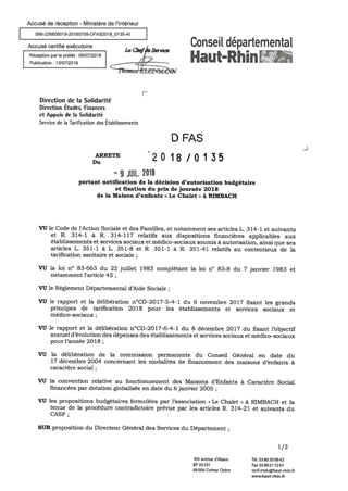 portant notification de la décision d'autorisation budgétaire et fixation du prix de journée 2018 de la maison d'enfants "Le Chalet" à RIMBACH Resumé Pièces jointes ARRETE Assemblée : Non défini Date : 09/07/2018 Rapporteur : Non défini Collectivité : Conseil départemental du Haut-Rhin Direction : Non défini Service : Direction de la Solidarité Domaine : Prix de Journée Commission :