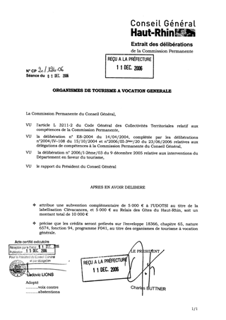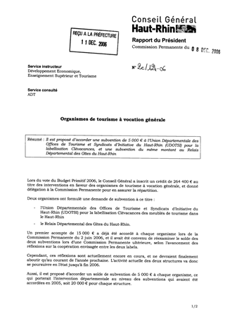 Il est proposé d’accorder une subvention de 5 000 € à l’Union Départementale des Offices de Tourisme et Syndicats d’Initiative du Haut-Rhin (UDOTSI) pour la labellisation Clévacances, et une subvention du même montant au Relais Départemental des Gîtes du Haut-Rhin