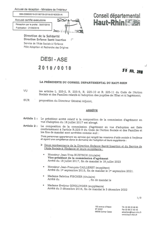arrêté relatif à la composition de la commission d'agrément en vue d'adoption Resumé Pièces jointes ARRETE Assemblée : Non défini Date : 30/07/2018 Rapporteur : Non défini Collectivité : Conseil départemental du Haut-Rhin Direction : Non défini Service : Direction de la Solidarité Domaine : Autres (non classés) Commission :