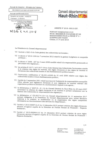 portant nomination d'un sous-régisseur d'avances et de mandataires pour la régie n° 3 GUEBWILLER / THANN Resumé Pièces jointes ARRETE Assemblée : Non défini Date : 14/08/2018 Rapporteur : Non défini Collectivité : Conseil départemental du Haut-Rhin Direction : Non défini Service : Direction des Finances Domaine : Autres (non classés) Commission :