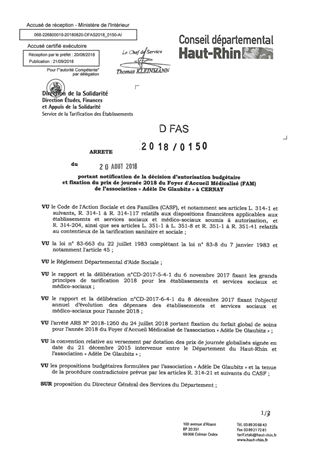 portant notification de la décision d'autorisation budgétaire et fixation du prix de journée 2018 du foyer d'accueil médicalisé (FAM) de l'association "Adèle de Glaubitz" à CERNAY Resumé Pièces jointes ARRETE Assemblée : Non défini Date : 20/08/2018 Rapporteur : Non défini Collectivité : Conseil départemental du Haut-Rhin Direction : Non défini Service : Direction de la Solidarité Domaine : Prix de Journée Commission :