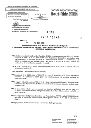 portant notification de la décision d'autorisation budgétaire et fixation du prix de journée 2018 du foyer d'accueil spécialisé (FAS) de l'association "AFAPEI" à BARTENHEIM Resumé Pièces jointes ARRETE Assemblée : Non défini Date : 20/08/2018 Rapporteur : Non défini Collectivité : Conseil départemental du Haut-Rhin Direction : Non défini Service : Direction de la Solidarité Domaine : Prix de Journée Commission :