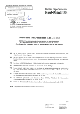 portant modification de l'autorisation de fonctionnement de l'établissement d'accueil d'enfants de moins de six ans "Les Larguotins", sis au 6 place du Marché à SEPPOIS LE BAS (68580) Resumé Pièces jointes ARRETE Assemblée : Non défini Date : 21/08/2018 Rapporteur : Non défini Collectivité : Conseil départemental du Haut-Rhin Direction : Non défini Service : Direction de la Solidarité Domaine : Accueil d'enfants Commission :