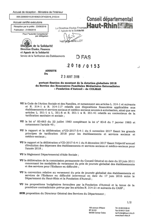 portant fixation du montant de la dotation globalisée 2018 du service des rencontres familiales médiatisées externalisées "Fondation d'Auteuil" de COLMAR Resumé Pièces jointes ARRETE Assemblée : Non défini Date : 23/08/2018 Rapporteur : Non défini Collectivité : Conseil départemental du Haut-Rhin Direction : Non défini Service : Direction de la Solidarité Domaine : Dotations financières Commission :
