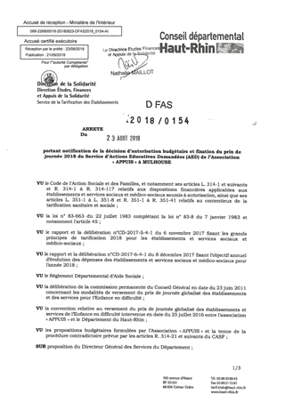 portant notification de la décision d'autorisation budgétaire et fixation du prix de journée 2018 du service d'actions éducatives demandées (AED) de l'association "APPUIS" à MULHOUSE Resumé Pièces jointes ARRETE Assemblée : Non défini Date : 23/08/2018 Rapporteur : Non défini Collectivité : Conseil départemental du Haut-Rhin Direction : Non défini Service : Direction de la Solidarité Domaine : Prix de Journée Commission :