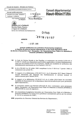 portant notification de la décision d'autorisation budgétaire et fixation du prix de journée hébergement et des tarifs dépendance 2018 du service d'accueil de jour "Escapades" de l'association pour l'aide et le maintien à domicile (APAMAD) à MULHOUSE