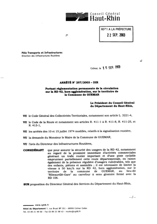 portant réglementation permanente de la circulation sur la RD 42, hors agglomération, sur le territoire de la commune de GUEMAR. Resumé Pièces jointes ARRETE Assemblée : Non défini Date : 15/09/2003 Rapporteur : Non défini Collectivité : Conseil départemental du Haut-Rhin Direction : Non défini Service : Direction des Routes Domaine : Circulation Commission :