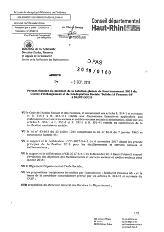 portant fixation du montant de la dotation globale de fonctionnement 2018 du centre d'hébergement et de réadaptation sociale "Solidarité Femmes 68" à SAINT LOUUIS Resumé Pièces jointes ARRETE Assemblée : Non défini Date : 03/09/2018 Rapporteur : Non défini Collectivité : Conseil départemental du Haut-Rhin Direction : Non défini Service : Direction de la Solidarité Domaine : Dotations financières Commission :