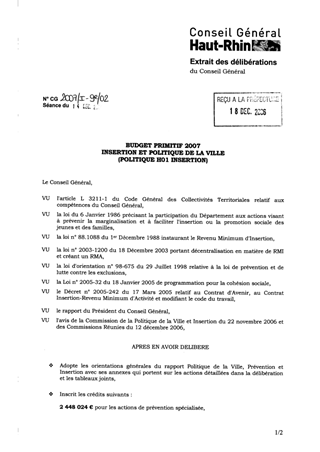 Le budget consacré à l'insertion des jeunes, au Revenu Minimum d’Insertion, aux contrats aidés, à la politique de la ville et aux centres socio-culturels, en 2007, s'élève à 57 177 148 €, soit une augmentation de 23 % par rapport au Budget Primitif 2006. Ce budget prend à la fois en compte l'augmentation importante du coût du RMI, (+ 14 %, liée notamment à la dégradation de la situation économique), la montée en charge des dispositifs Contrats d'Insertion – Revenu Minimum d'Activité (CI-RMA) et Contrats d'Avenir (CAV), ainsi que l’effort croissant en direction de la prévention spécialisée et la poursuite d’une politique affirmée en faveur des plus démunis. Ce rapport propose également la mise à jour du Règlement Départemental d'Aide Sociale (RDAS), suite à la parution de plusieurs textes législatifs.