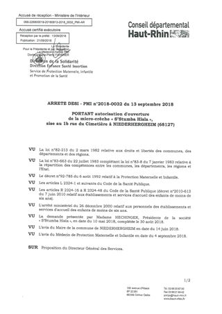 portant ouverture de la micro-crèche "S'Stumba Hisla", sise au 1b rue du Cimetière à NIEDERHERGHEIM (68127) Resumé Pièces jointes ARRETE Assemblée : Non défini Date : 13/09/2018 Rapporteur : Non défini Collectivité : Conseil départemental du Haut-Rhin Direction : Non défini Service : Direction de la Solidarité Domaine : Accueil d'enfants Commission :