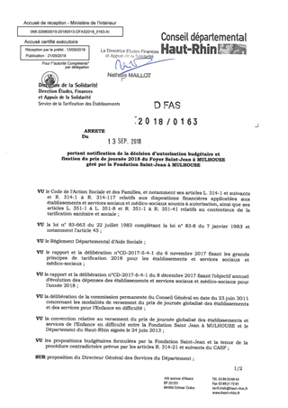 portant notification de la décision d'autorisation budgétaire et fixation du prix de journée 2018 du foyer Saint-Jean à MULHOUSE géré par la Fondation Saint-Jean à MULHOUSE Resumé Pièces jointes ARRETE Assemblée : Non défini Date : 13/09/2018 Rapporteur : Non défini Collectivité : Conseil départemental du Haut-Rhin Direction : Non défini Service : Direction de la Solidarité Domaine : Prix de Journée Commission :