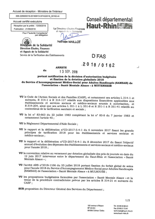 portant notification de la décision d'autorisation budgétaire et fixation de la dotation globalisée 2018 du service d'accompagnement médico-social pour adultes handicapés (SAMSAH) de l'association "Santé Mentale Alsace" à WITTENHEIM Resumé Pièces jointes ARRETE Assemblée : Non défini Date : 13/09/2018 Rapporteur : Non défini Collectivité : Conseil départemental du Haut-Rhin Direction : Non défini Service : Direction de la Solidarité Domaine : Dotations financières Commission :