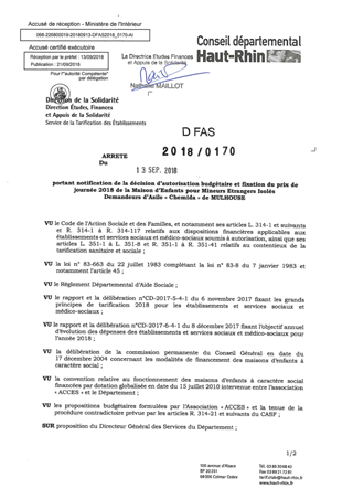 portant notification de la décision d'autorisation budgétaire et fixation du prix de journée 2018 de la maison d'enfants pour mineurs étrangers isolés demandeurs d'asile "Chemida" de MULHOUSE Resumé Pièces jointes ARRETE Assemblée : Non défini Date : 13/09/2018 Rapporteur : Non défini Collectivité : Conseil départemental du Haut-Rhin Direction : Non défini Service : Direction de la Solidarité Domaine : Prix de Journée Commission :