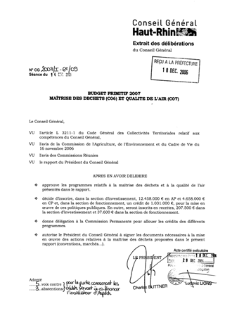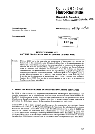 L’année 2007 verra la poursuite du programme d’équipement en matière de traitement et de valorisation des déchets du Haut-Rhin et le développement des actions de sensibilisation en faveur du recyclage et de la réduction à la source des déchets. On mènera également une réflexion sur la politique du Conseil Général dans le domaine des énergies renouvelables et de la maîtrise de l’énergie. L’ensemble de ces programmes d’aides du Département, au profit principalement des communes et des intercommunalités, se traduit par une inscription, dans la section d’investissement, de 12.458.000 € en AP et de 4.658.000 € en CP et, dans la section de fonctionnement, d’un crédit de 1.031.000 €. En outre, des recettes à hauteur de 207.500 € en section d'investissement et de 37.600 € en section de fonctionnement sont attendues.