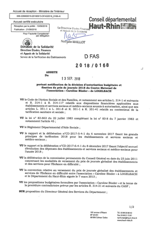 portant notification de la décision d'autorisation budgétaire et fixation du prix de journée 2018 du centre maternel de l'association "Caroline Binder" de LOGELBACH Resumé Pièces jointes ARRETE Assemblée : Non défini Date : 13/09/2018 Rapporteur : Non défini Collectivité : Conseil départemental du Haut-Rhin Direction : Non défini Service : Direction de la Solidarité Domaine : Prix de Journée Commission :