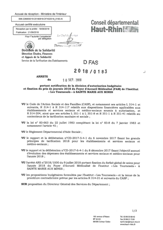 portant notification de la décision d'autorisation budgétaire et fixation du prix de journée 2018 du foyer d'accueil médicalisé (FAM) de l'institut "Les Tournesols" à SAINTE MARIE AUX MINES Resumé Pièces jointes ARRETE Assemblée : Non défini Date : 18/09/2018 Rapporteur : Non défini Collectivité : Conseil départemental du Haut-Rhin Direction : Non défini Service : Direction de la Solidarité Domaine : Prix de Journée Commission :