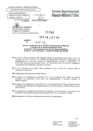 portant notification de la décision d'autorisation budgétaire et fixation de la dotation globalisée 2018 du service d'accompagnement à la vie sociale (SAVS) de l'Institut "Les Tournesols" à SAINTE MARIE AUX MINES Resumé Pièces jointes ARRETE Assemblée : Non défini Date : 18/09/2018 Rapporteur : Non défini Collectivité : Conseil départemental du Haut-Rhin Direction : Non défini Service : Direction de la Solidarité Domaine : Dotations financières Commission :